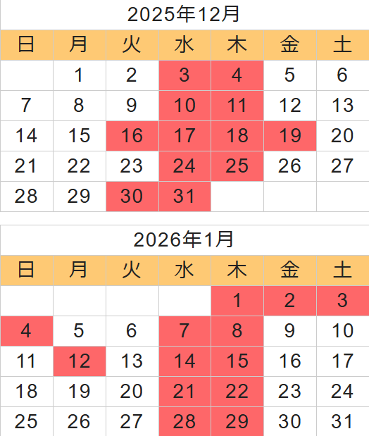 営業日程は毎日更新致します。法人様への出張修理等々で急遽変更となることがございますので、特定のお時間にお越しいただく場合にはご来店前にご連絡頂くと幸甚です。